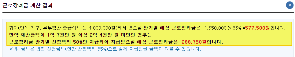 모의계산기를 통해 위와 같이 좀 더 간단하고 빠르게 지급액을 계산해 보실 수 있습니다. 특히, 9월 상반기 신청 시에는 지급액의 35%만 지급되니 이점도 참고해 주세요.