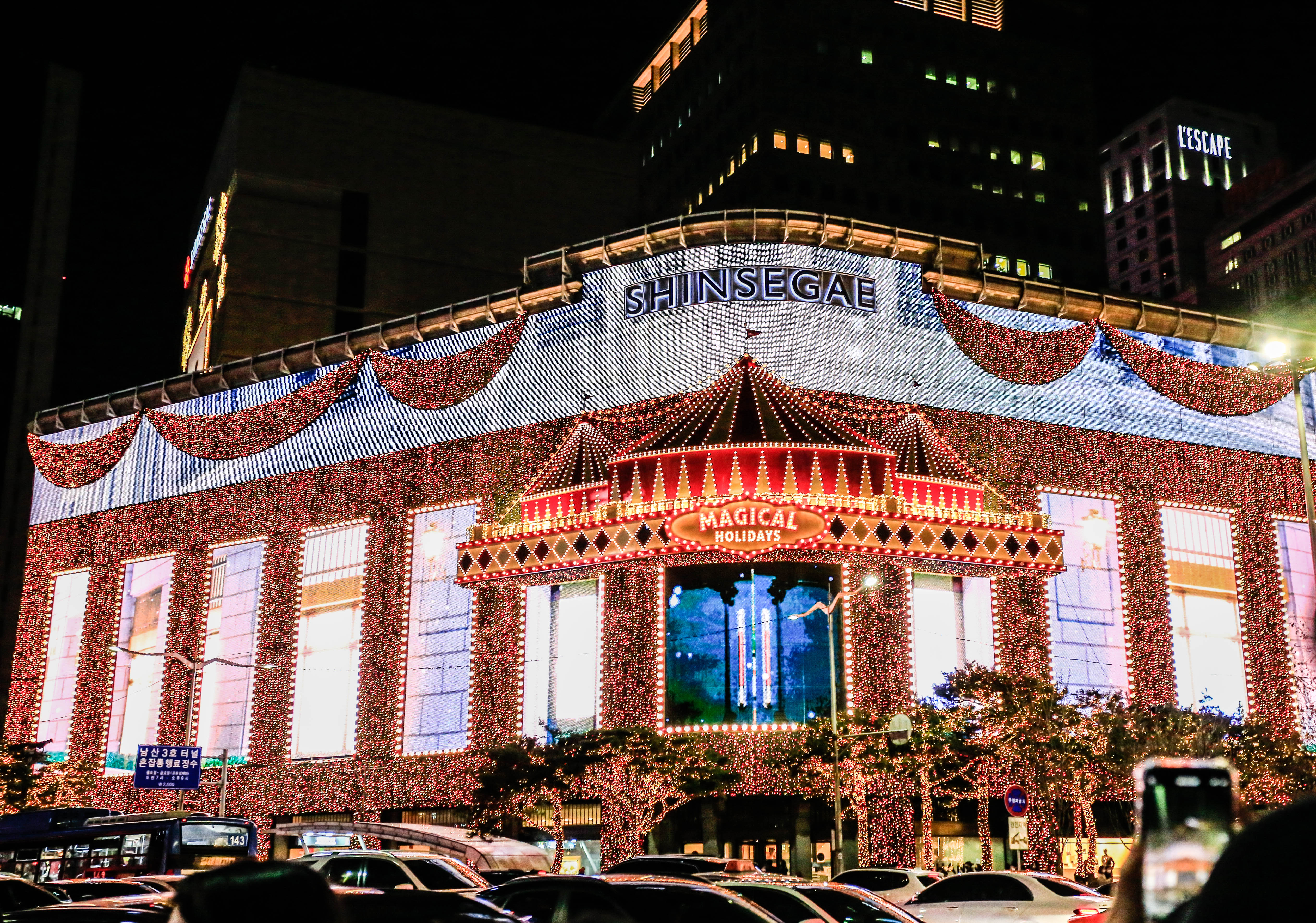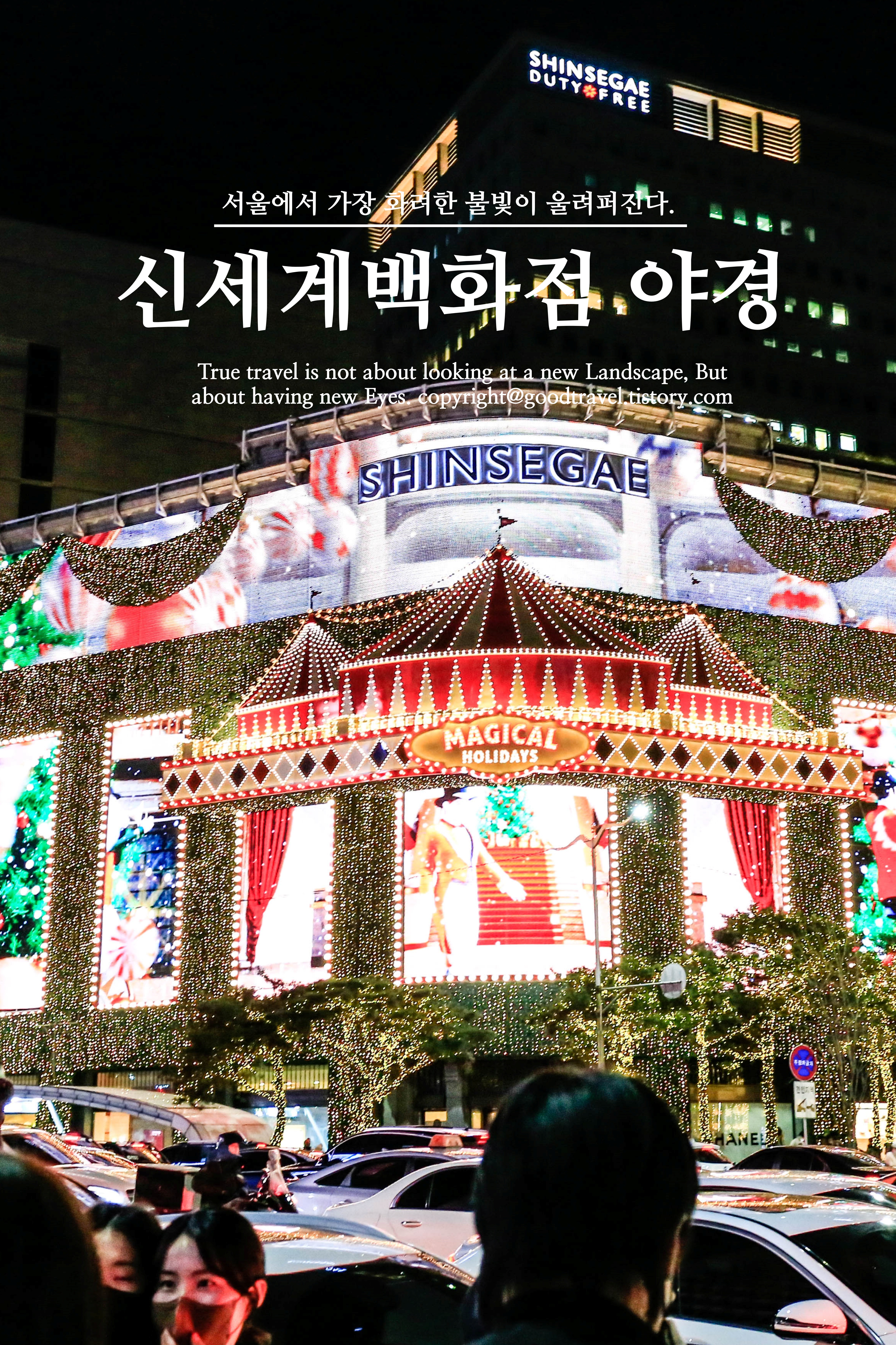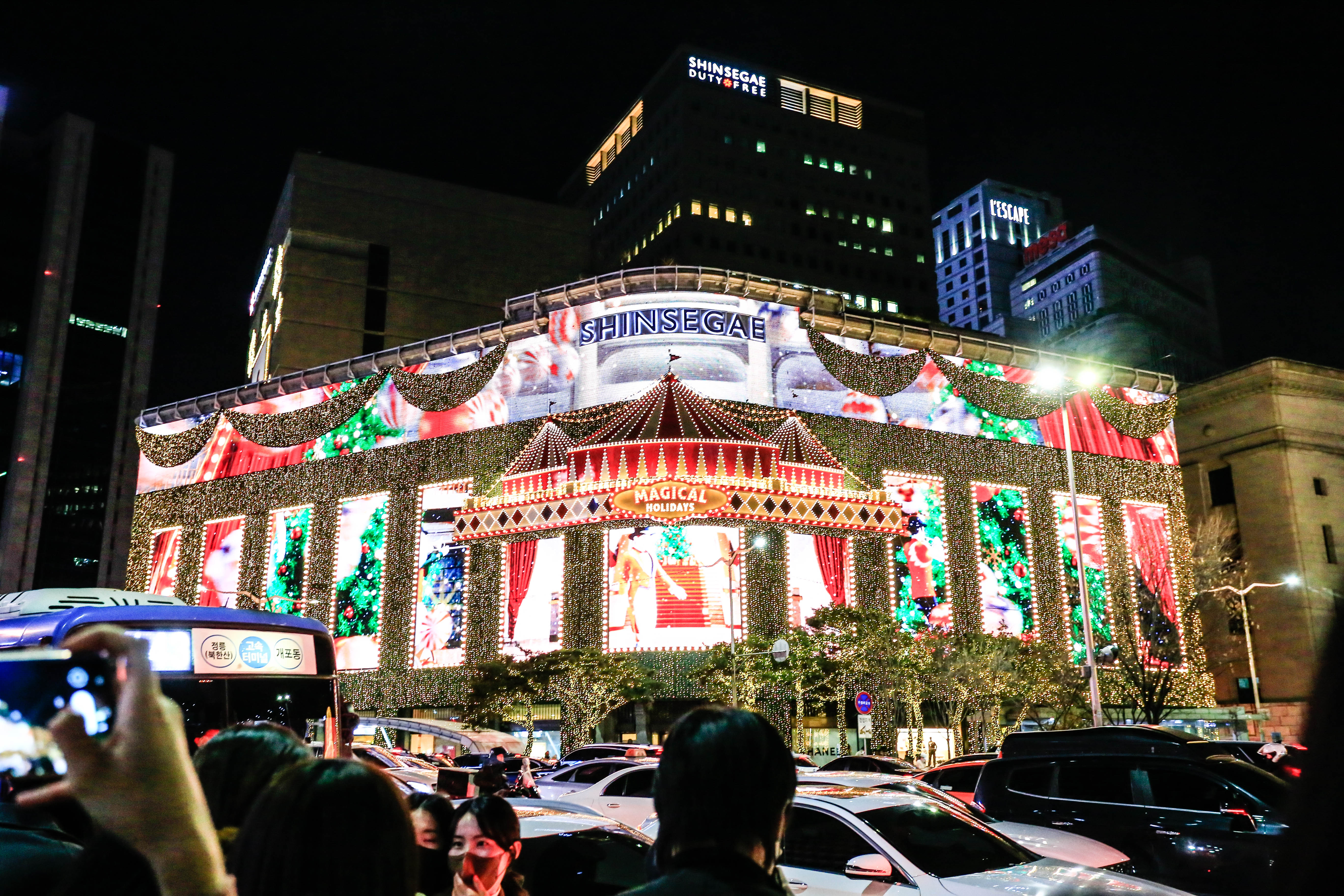 화려한 네온이 내 어깨를 감싸는 신세계백화점 야경
